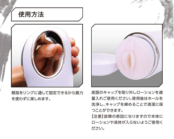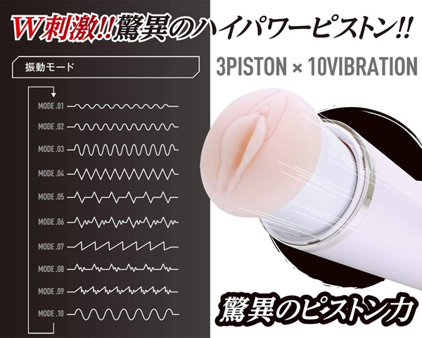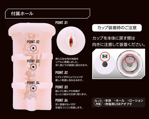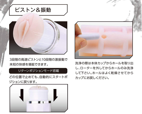 | 握力いらずで快感に集中できる、驚異のハイパワーを実現したピストンオナホ!ダブルの刺激とハイパワーが自慢のピストンモードを搭載したカップ型の電動オナホは他に類を見ません♪3段階の高速ピストンと10段階もの激振動で、これまでにない未知の快感を体感できます!本体上部の空洞部分には親指を通して固定できるので、握力をさほど使わずに使用可能。 付属のホールはリアルな形状で、挿入口付近はヒダとイボのジョリジョリが貴男の息子を優しく刺激♪縦ヒダと横ヒダの肉塊とねっとり絡みつく快感、突く度に先端を襲うイボによるコリコリ刺激がたまりません!ご使用後はホールを取り外して洗浄可能♪電源はUSB充電式で、4時間の充電で約40分の連続使用が可能です。 |
