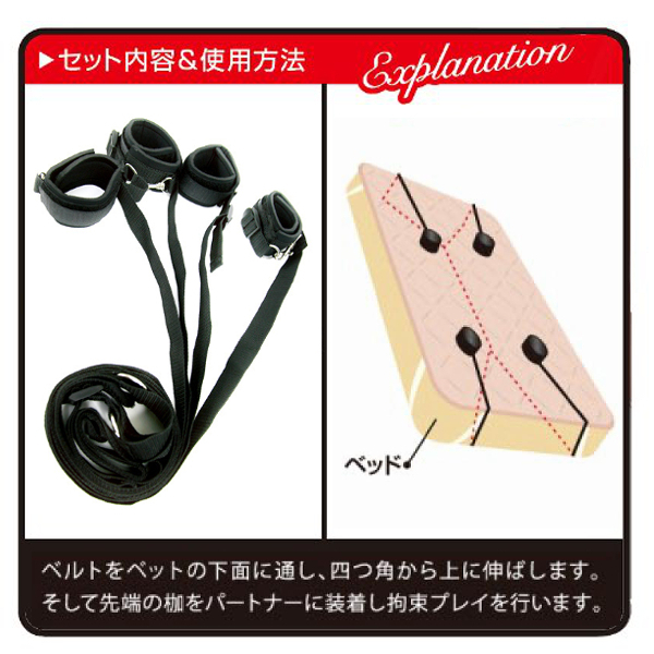 | ベッド拘束プレイを自宅でも!あなたの欲望を叶えるSMグッズシリーズ「ELock」。 ベルトをベッドの下に通して上下から出し、手枷と足枷をパートナーに装着したら完成!ベッドの脚に繋がなくても良いので、マットレスタイプでも使用可能です。 枷はマジックテープ式でサイズ調節も楽々!肌に当たる部分はソフトなウレタン素材を使用し、お肌を痛める心配もありません。 エロ絵師、尾髭丹氏の肉感的なパッケージにも注目です。 ※設置場所の状態を確認してからご使用ください。 |