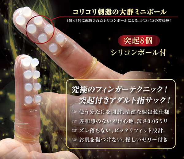 | 安全、清潔に使えて気持ちいい♪ラブグッズ版の指サック「フィンガースキンDX (G−4)」です。 シリコン製のミニボールに突起が8個ついた指サックでクリトリスを愛撫したりアソコに挿入したりと使い方は自由自在!4個×2列に配置されたシリコンボールはアソコに挿入するとボコボコの粒快感♪6個入りで個包装されているので清潔にお使いいただけ、Gスポットをズリズリしたりと着けるだけでご自身の指技をグレードアップしてくれます!薄さはコンドームのような0.06mm。 挿入したときの体温が感じられたりとお互いに興奮すること間違いなし!表面には挿入をフォローしてくれるゼリーが塗布されていて平均的な男性の指サイズだからフィット感も抜群。 指責めのメリットを味わいながらコリコリ感やズリズリ感を与えることができます! |