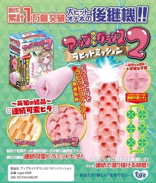 | 大ヒット商品「アップサイドグランス」の進化版として登場しました♪内部には1cm単位で変化する独自のヒダ構造を採用し、新たな使用感を実現!大きなヒダの中に繊細な極細ヒダを重ねることで、連続する変化に富んだ刺激を体感できます♪非貫通タイプでしっかりとした密着感があり、圧迫と包み込みを同時に楽しめます!素材はエラストマー製で、やや柔らかめの弾力が心地よくフィット♪本体は手に収まりやすいサイズ感で、操作性にも優れています!付属のローションを使用すれば、よりスムーズな挿入が可能♪シリーズの特徴である可変ヒダ構造をさらに進化させ、より立体的な刺激を追求しました!長時間の使用でも飽きのこない設計で、繰り返し楽しみたくなる仕様です♪進化した構造で、新しい刺激を求める方におすすめの一本です! |