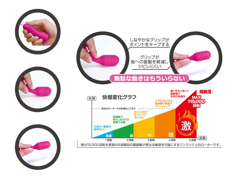 | 定番のシングルローターに使いやすさをプラス!持ち手部分がついてグッと遊びやすくなったコンパクトローター。 尻尾のようなつまみ部分を持って使用することで、振動による手の痺れがなくなって快適!より長く責めることができるようになり、ラブタイムにもいっそう熱が入るかも。 微弱〜激までの5段階調節で、未知の快感を得られるシングルローターです。 単四電池×2本使用。 |
