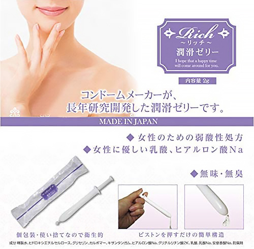 | コンドームメーカーが長年研究開発した潤滑ゼリーです。 潤い不足で悩む女性のために作った弱酸性処方で女性に優しい乳酸ヒアルロン酸Na。 ●急性毒性試験済みなので安心してお使いいただけます●無色透明・無味無臭の潤滑ゼリー●注射器型だからワンタッチで手を汚さず衛生的●ピストンを押すだけの簡単構造●個包装・使い捨てなので衛生的。 30本入り |