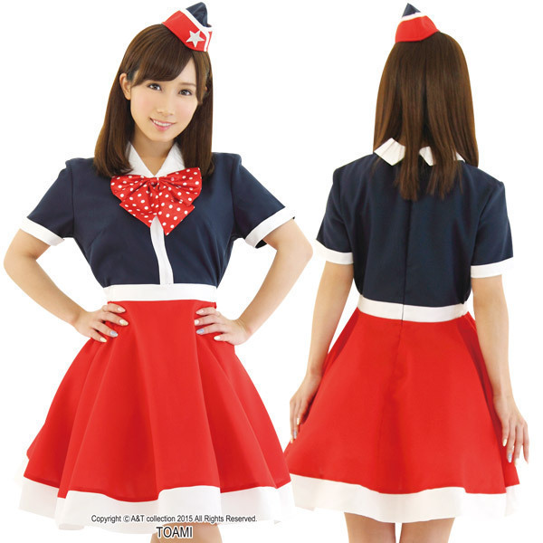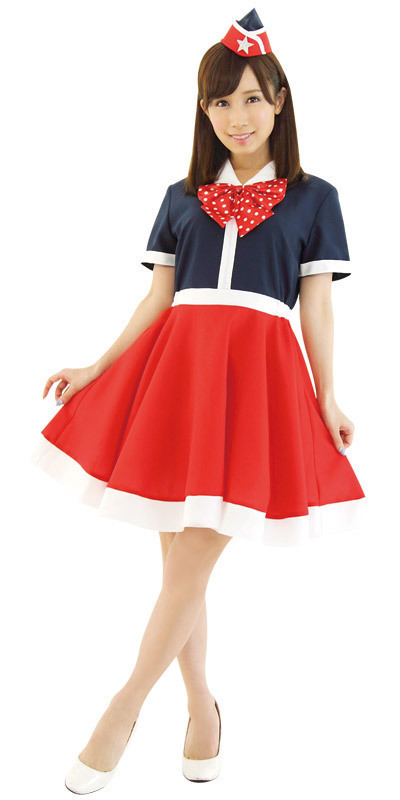 | レトロながらもポップな雰囲気漂うキャビンアテンダント風コスチューム。 ●レッド×ネイビー×ホワイト●ライン入りワンピース(リボン付き)●星モチーフ付きのミニ帽子。 CAには見えないほど、ハイカラなデザインに仕上げたオシャレで可愛いコスプレ衣装です。 |