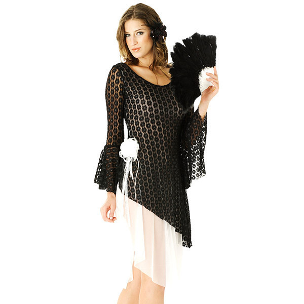 | 落ち着いた雰囲気の中に、セクシーな大人の女性の魅力を感じるフラメンコのコスチューム。 スカート部分がシースルー素材、ドレスは黒のレース使いと優雅さをかもし出しています。 扇子とコサージュも付いて3点セットです。 |