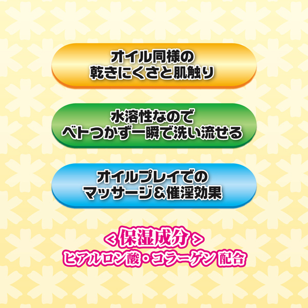 | 南国チックで官能的な香りが特徴のイランイランを配合した、ベタつき少なくサッと洗い流せる水溶性ローション200ml。 高保湿なヒアルロン酸やコラーゲンをたっぷり使用した贅沢仕様!口に入っても大丈夫な成分を使っているためオーラルプレイもOK◎オイルのような質感で乾きにくく長時間のマッサージでも大活躍♪ |