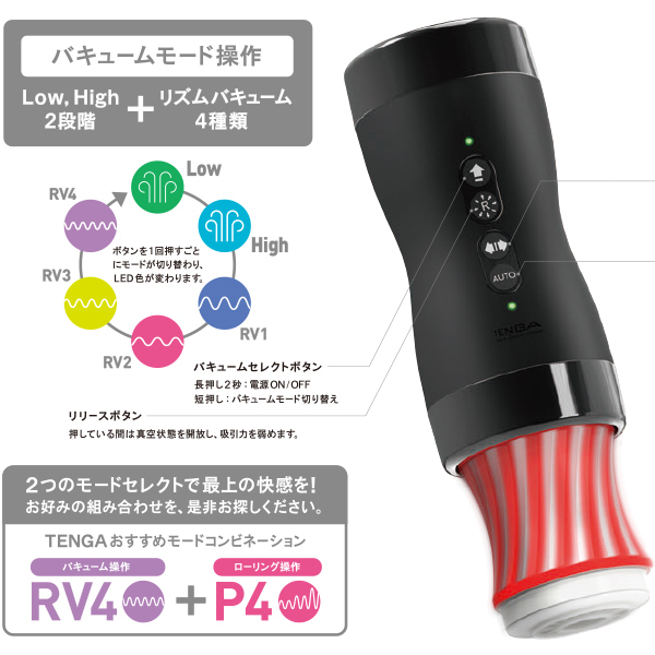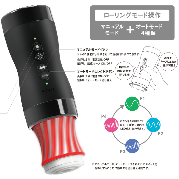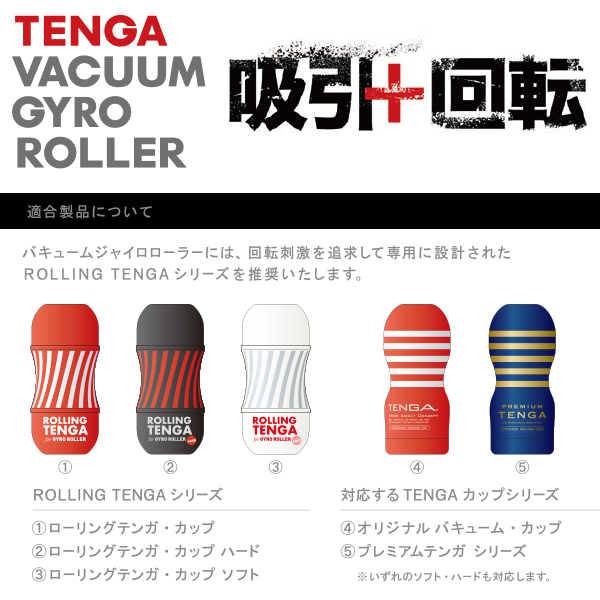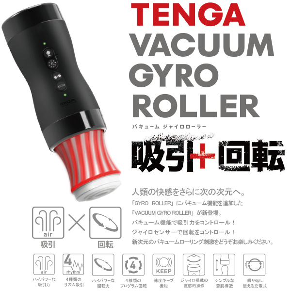| TENGAカップ用電動コントローラ「GYRO ROLLER」に強力バキューム機能を追加!4種類のリズム吸引×4種類の回転で刺激する「バキュームジャイロローラー」。 ジャイロセンサー搭載!手を傾けるだけで自在にコントロールできる新感覚のテンガ体験をお楽しみください。 150分間充電で約60分連続稼働可能!回転刺激を追求して設計されたローリングテンガシリーズ推奨 |