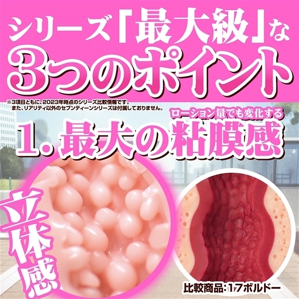 | トイズハートが誇る看板シリーズ「セブンティーン」、この集大成として大々的に開発をスタートしたのがセブンティーン リアリティです。 改めて二次元と三次元におけるリアルさを追求し、新たなホンモノ体験を具現化することに成功しました。 具体的に一番の試行錯誤ポイントは、素材の硬さです。 最終的にこの硬度に落ち着いた理由としては、イボ=粘膜感としてのリアルが再現できた為です。 絶妙なバランスでイボではなく、まるで粘膜のように感触を感じられ、最終的には満場一致でこの硬度に決定しました。 ローション注入量によっても粘膜感が格段に変化することも特徴のひとつです。 自分だけの丁度良いローション量を探りながらホンモノ体験を楽しんでいただければ幸いです。 |