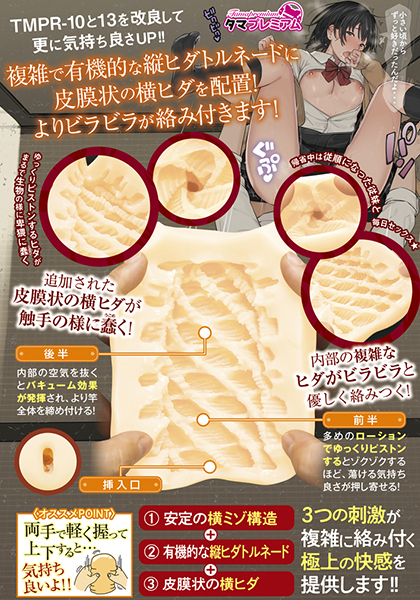 | タマプレミアム18弾!3種の刺激が複雑に絡みつく410gの非貫通オナホ。 触手の様なヒダが蠢き絡みつき、蕩ける気持ちよさが押し寄せる!空気を抜けば密着力UP、強力バキュームを体感できます。 横ミゾ×縦ヒダスパイラル×皮膜状の横ヒダ構造が極上の快感を生み出す!まったり楽しめる高弾力&高伸縮素材の日本製オナホ。 パケ絵は「楝蛙(おうちかえる)」氏◎ローション付●メーカー型番:TMPR-018 |