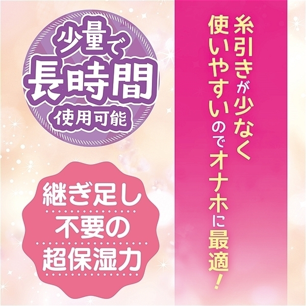 | 糸引きが少なく使いやすい、オナホに最適!驚きの潤滑性&持続力で少量で長時間使用可能。 継ぎ足し不要の超保湿力でねっとりヌルヌルがずーっと続く●天然潤い成分配合●安心の日本製●無香料 |