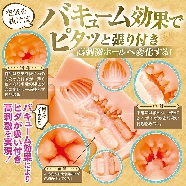 | 日本製、国内自社工場製。 エルフの名器はバキューム特化!4方向から大き目のヒダが締め付けてくる!下部には縦ヒダ、上部にはイボイボがあり吸い付き絡みつく。 空気を抜けばバキューム効果でピタッと張り付き感触が変化する!挿入方向自由!左右上下あらゆる方向から使用可能(メーカー推奨は中央にS字の縦ヒダがある方が下部です)。 フレキシブルスキン、高弾性・高伸縮素材、匂い控えめ、非貫通型オナホール、ローション付き |