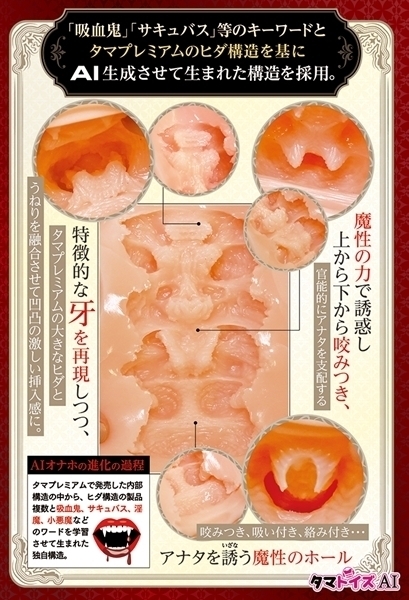 | AIが理想を追求して設計した非貫通オナホール♪数ヶ月間、AIが徹底的に学習して生まれました!「吸血鬼」や「サキュバス」等の人気構造を融合♪内部のヒダが独特な刺激と心地よさを演出します!国内自社工場製の高品質な日本製アイテム♪穴の長さは約13.5cmで使いやすさも抜群!ローションも付属し、すぐにご利用いただけます♪ AIが生み出した新感覚の癒しをぜひ体験してください!●TMAI-11 |