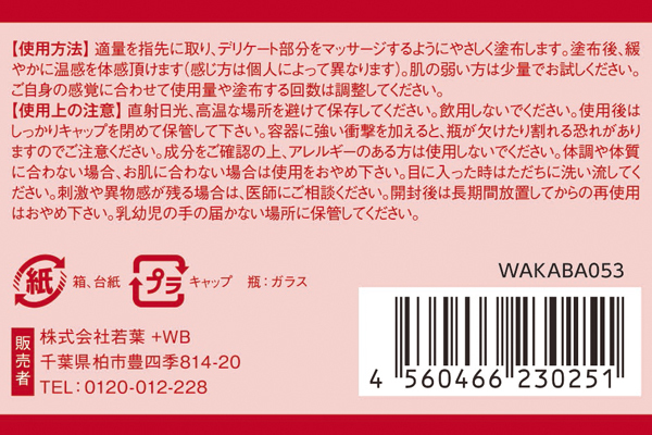 | 良い香りがふんわり漂う♪滑りを良くしながら感度を高める温感仕様の女性用マッサージオイル。 優雅で上品な香りのローズオイル、抗菌殺菌作用のあるレモングラス、官能的なフランキンセンスなどの成分を配合!業界初ハーブオイルを使用した画期的なデリケートゾーン用のオイルです。 適量塗り込むとジンワリ温まり、高揚感&感度が高まります。 容量5ml |