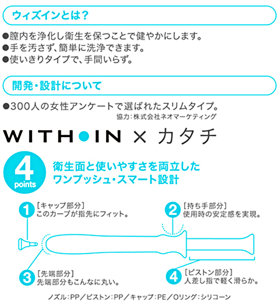 | 性交前後や生理中、オリモノが多い時に◎デリケートゾーンを内側から綺麗にお手入れできるクサノハ化粧品の日本製膣洗浄器(管理医療機器)。 挿入しやすいスリムタイプで、衛生的な一回使い切りタイプ♪膣内に挿入してワンプッシュすれば手を汚さず簡単に洗浄できる!使い心地はとってもナチュラルで、初めての方でも安心してお使いいただけます。 無色透明&無味無臭 |