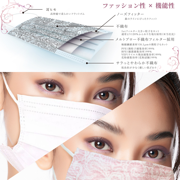 | いまや生活で必須アイテムとなったマスクは、お洒落さを追求したいとはいえ、マスク本来の機能はしっかりと担保したいところです。 繊細な花柄レースプリントがエレガントな「マスクセレブYURIKO」は、フィルター性能試験で99%カット実証、鼻にぴったりとフィットするノーズワイヤー入りで立体プリーツ加工によってぴったりと顔まわりにフィットさせて身につけることができる、ファッション性と機能性を兼ね備えた使い捨てのおしゃれなマスクです。 1層目に不織布フィルター、中間層に緻密な構造による穀物繊維のメルトブローンフィルター、3層目に不織布フィルターを採用している3層構造マスクです。 目には見えないウイルスや花粉、細かなチリが鼻や口から入り込むのを防ぎ、風邪の予防対策にもなります。 ※マスクは感染(侵入)を完全に防ぐものではありません。 ※カラーは「ベージュ」になります。 |
