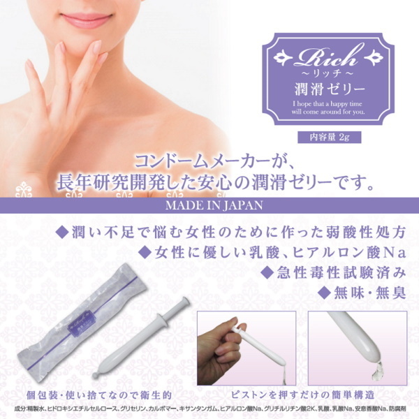 | コンドームメーカーが長年研究開発した潤滑ゼリー!潤い不足で悩む女性のために作った弱酸性処方で女性に優しい乳酸、ヒアルロン酸Na。 注射器型のワンタッチで手を汚さず衛生的です。 |