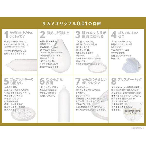| これまでよりもさらに薄く、柔らかく改良されたコンドーム、サガミオリジナル0.01Lサイズ。 幸福の0.01ミリで使い心地は抜群♪まるで生でしているような感覚でゴムが苦手な方でも安心!薄くてつけていないかのような装着感をぜひ実感してください♪特別な日は001にしよう!ゴム臭もほとんど感じず、製品の品質も最高峰です。 シリーズ史上最薄の0.01ミリで肌のぬくもりを瞬時にお伝えします♪ |