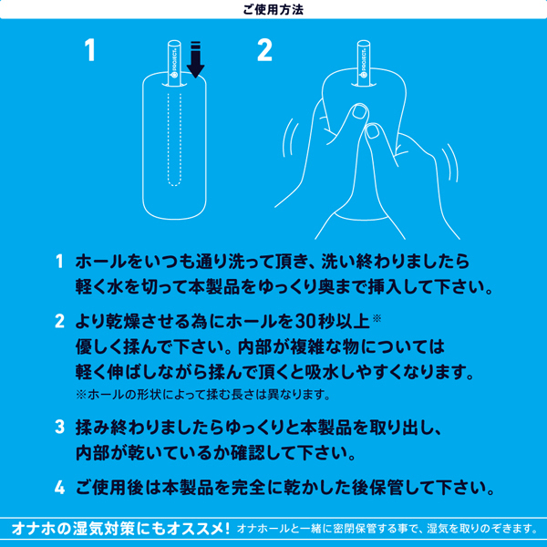 | オナホを洗った後に挿しこんで揉むだけで速乾燥。 『G PROJECT HOLE QUICK DRY 珪藻土STICK』は、挿し込んだ瞬間から棒状の珪藻土が水をしっかり吸収して乾燥させる!今まで奥の乾燥が難しかった大型ホールにも対応していて、オナホと一緒に密封保管する事で、湿気を取り除いてくれたりといった効果も期待できます。 驚きの吸水力と速乾力に優れた本製品を是非お試しください! |