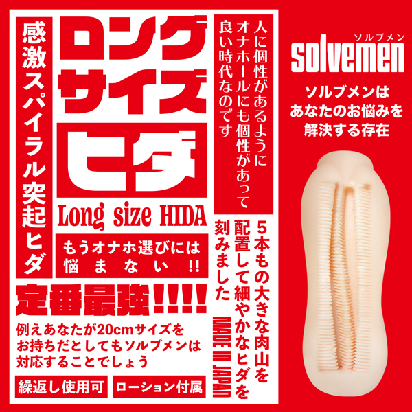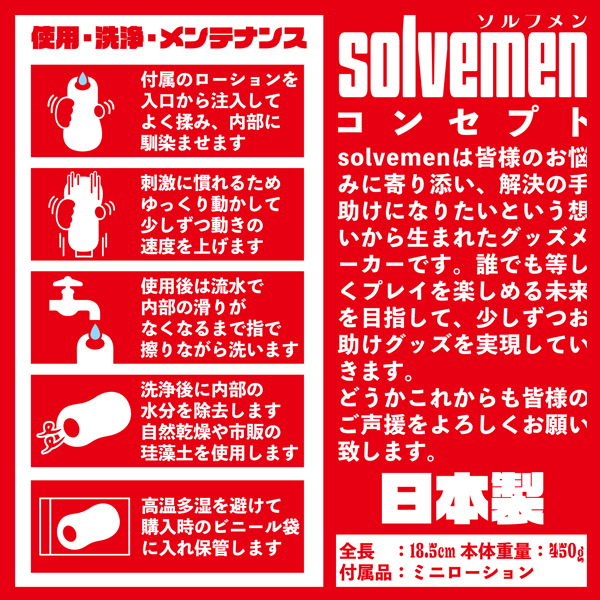 | 様々な人の悩みをなんとか解決したいというコンセプトをもとに生まれた「ソルブメン」より、すっぽり包み5つの縦ヒダで弾くように刺激する♪全長18.5cm、重さ450gのビッグな日本製の非貫通オナホが登場。 ヒダ突起に螺旋に渦巻くスパイラル構造をプラス、快感を後押しする内部に設計!ほかにもショートサイズもご用意しております。 繰り返し使用可能 |