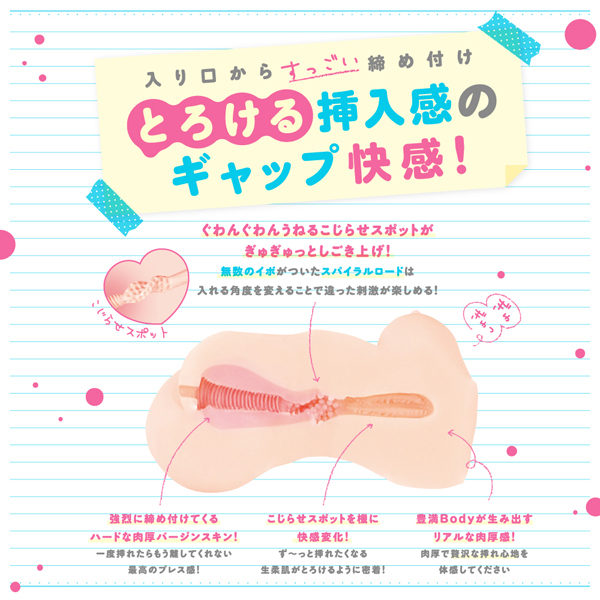 | ハードtoソフト!快感変化のギャップ構造。 ぐわんぐわんうねるこじらせスポット搭載!ずっしり肉厚540gの豊満Bodyはとっても贅沢な挿れ心地!強烈に締め付けるハードなバージンスキンの入口から、ずーと挿れたくなるようなとろとろソフト素材への快感の変化を楽しめます!真ん中に配置されたこじらせスポットは、ピストンのたびにぎゅぎゅっとしごき上げ!締め付け・こじらせ・生柔肌の3つの快感。 贅沢な挿れ心地を体感してください。 |