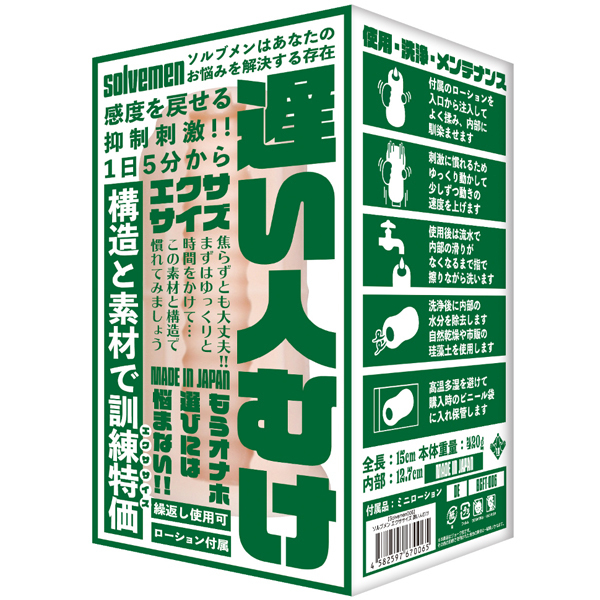 | ソルブメンはあなたのお悩みを解決する存在です。 「遅い人向けエクササイズ」は常日頃から自分の遅さに悩む方に向けた提案型お悩み解決ホール。 普通のホールでは注目されにくく専用グッズが開発されにくい分野ですが、ソルブメンのエクササイズホールなら毎日楽しみながら新しい自分へと前進する事ができるでしょう。 遠い昔の感度に再会できる喜びを知ったらもう普通のホールには戻れません。 あなたはオナホ選びに悩む必要はなくなります。 あなたのためにソルブメンがいるのです。 安心安全の日本製で繰り返し何度でも利用が可能です。 週に3〜4回はエクササイズにチャレンジしてくださいね! |