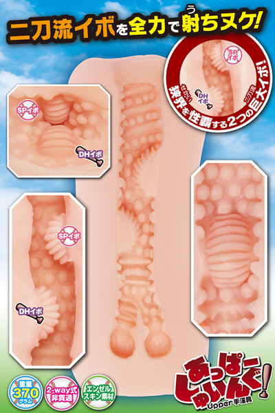 | 二刀流イボを全力で射ちヌケ!あっぱーしゅいんぐ!(Upper手淫具)は、ロングセラー商品「ふるしゅいんぐ!(FULL手淫具)」の続編となる、全長165mm、重量370gのミドルオナホールです(2way式非貫通)。 中間部に配置された2つの巨大ヒダイボ(二刀流イボ)が最大の特徴で、狭道内に交互で連なり上下から圧迫する高刺激構造となっています。 その二刀流イボとの快感アクセントとして「中イボ、横ヒダ」を内部に全面配置。 最奥の「2つのフィニッシュポイント」を隔てる「鋭角タテヒダ」のエッジも加わり、全体を通して緩急のある多様な刺激をお楽しみいただけるオナホールとなっています。 ※保管に便利な専用ブリスターケース、専用ミニローションが付属。 |