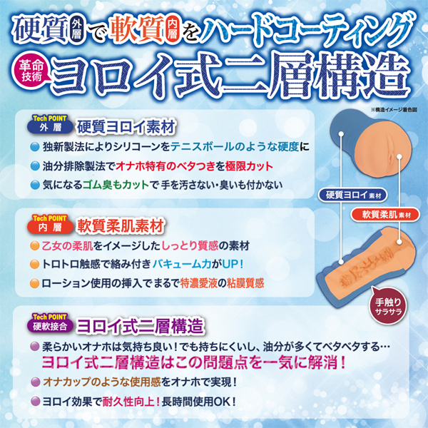 | 「柔らかいオナホは気持ちいい!でも持ちにくいし油分がベタベタする。 」とお嘆きのあなたに、ヨロイ×乙女の柔肌!硬質素材(外層)で軟質素材(内層)をハードコーティング!鎧乙女オトメイルは硬軟素材が接合した革命技術「ヨロイ式二層構造」の非貫通オナホールです。 外層は独自技術により、オナホ特有の「ベタつき」や「ゴム臭」を極限カットし、テニスボールのような硬度に生成しました。 そして、硬いヨロイに覆われた内層部分は、メリハリのきいた硬度ギャップのトロトロ軟質素材。 乙女の柔肌をイメージしたしっとり質感で絡み付き、粘着質なバキューム効果を生み出します。 鎧乙女オトメイル ジャンヌ、ダルクは無尽蔵に配置された「ゴシック式イボ構造」がねっとり纏わり付く粘膜質感、べたつき、臭いを排除した硬軟素材接合のヨロイ式二層構造「鎧乙女オトメイル」を是非お試しください。 簡単お手軽なオナカップの使用感で、非貫通オナホのバキューム力を得られるオナホールです。 |