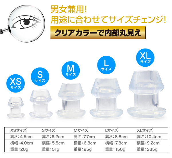 | 少し大きいアナタでも安心♪内部が丸見えな拡張トンネルプラグ!内部穴360度見渡せる極上の光景幅広いプレーが可能な多用途プラグ柔軟性と形状保持力を備えた透明色の拡張アイテムです。 拡張プレイだけでなく観賞や洗浄、ローション注入等、幅広く活用できます。 5サイズ展開はレディース、メンズ、初心者、上級者と使い分けが可能。 ご自分の判断でご利用ください。 素材:TPRサイズ:Lサイズ全長:88mm 最大幅:71mm(底部を除く)空洞内径:33mm |