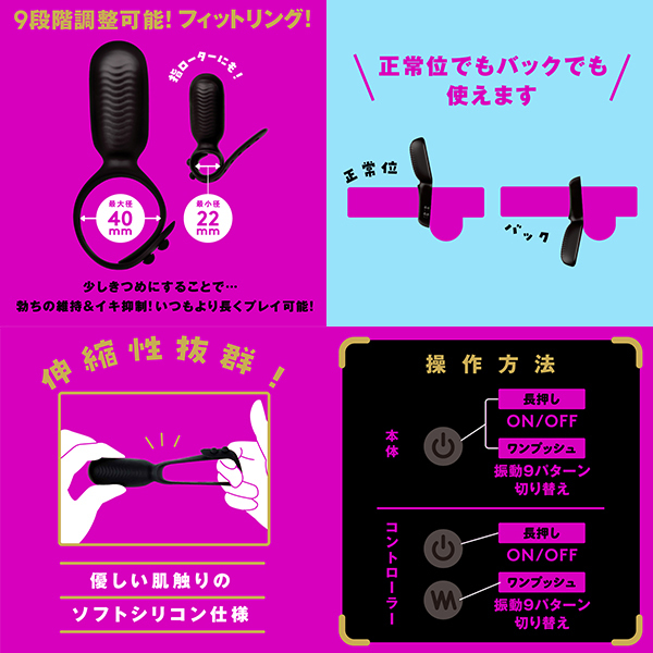 | あの子の感度が爆上がり夢の同時イキができちゃうカップル用ローター!自分のサイズに合わせて調整できるフィットリングは9段階調整可能!ベルト式なのでプレイ中の着脱もラクラク!伸縮性バツグンで肌触りも優しい高品質ソフトシリコン仕様!9パターン振動のハイパワーローター搭載で激しい夜になること間違いなし!遠隔操作可能なコントローラー付きなので、プレイ中の振動パターンの切り替えが簡単!プレイ中も重さが気にならないように軽さにもこだわりました。 9つ振動パターン&完全防水IPX7等級&充電用USBケーブル付属。 充電時間:約80分。 連続可動時間約20〜30分。 |