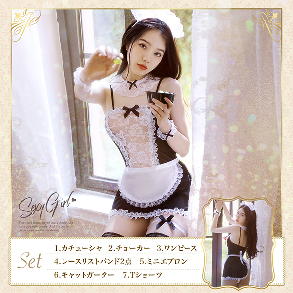 フリーサイズ セット内容:カチューシャ、チョーカー、ワンピース、レースリストバンド×2、ミニエプロン、キャットガーター、Tバックショーツ |