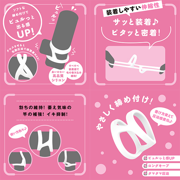 | 超!ぷにっとりんぐから根元と竿元に簡単装着が出来るツインロックソフトverが登場。 サッと装着♪ピタッと密着!装着しやすい伸縮性、臭いのない高品質シリコンで根元と竿元をやさしく締め付け、着けてるストレスを軽減!すべすべ装着感で毛の巻き込みを緩和。 挟み込んだり押しだしたりタマタマ圧迫の使い方も色々。 着け方を変えて圧迫感も変化♪自分好みの締め付けで、勃ちの維持!萎え気味の竿の補強!イキ抑制!クロスさせると包囲圧迫で頑強度MAXに!ソフトな締めつけでビュルっと出る感UP♪ゆ〜っくり夢心地発射! |