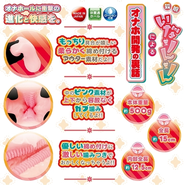 | 狐仙女による新たな刺客が届いた!!正確にはまだ仙女には至らない未熟な狐三姉妹の末っ子である。 今回の刺客は「ガブ噛み妖技!!もちっとカミリー」ガブ噛みというだけあって、噛まれる感覚が斬新な一品!噛まれると言ってもそこは性的な情緒に溢れた仕上がりとなっており、つまりは次のようなコトである。 1、もっちりとしたアウターにぬぷぬぷと吸い込まれる。 2、もっちりアウターがゆっくりと締め付け絡んでくる。 3、インナーの上下にハード素材のジョリ突起がある。 この1〜3を組み合わせる事で斬新すぎる「ガブ噛み」体験が出来るのである。 いなりんりんが自信満々に言ってくる。 「キミのアソコをカミリーしちゃうよっ」 |