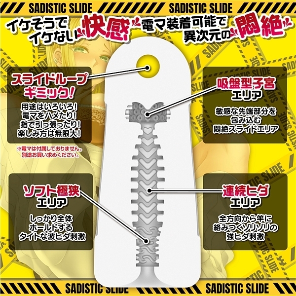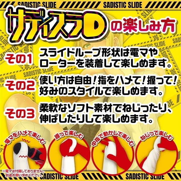 | 先端を刺激するギミックホール「サディスラD」は伸ばして楽しむスライドオナニーが楽しめるオナホールです。 電マやローターを装着できるオナホールが欲しい!オナホールを伸ばして刺激したい。 という新しい想像から「サディスラD」は開発されました。 上部に空いている「スライドループギミック」は電マやローターをハメたり、引っ張ったり、握ったり、ねじったりと、いろいろな楽しみ方で遊べます。 「電マ」「大型ローター」を装着することにより、他では味わえない「先端を直撃する強力な振動」で「イケそうでイケない状態」【悶絶】を味わえます。 根本をおさえて伸ばして楽しむ「スライドオナニー」やねじって楽しむ「スクリューオナニー」などオナホール本体の「形状変化」に取り組んだ「新しいスライドオナニー」をお楽しみください。 非貫通オナホール、ソフト素材使用。 保管に便利なブリスターケース付き、専用ローション付き。 ※電マ、ローター等は付属しておりません、別途お買い求めください。 |
