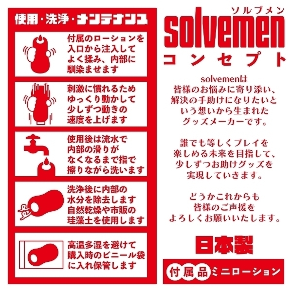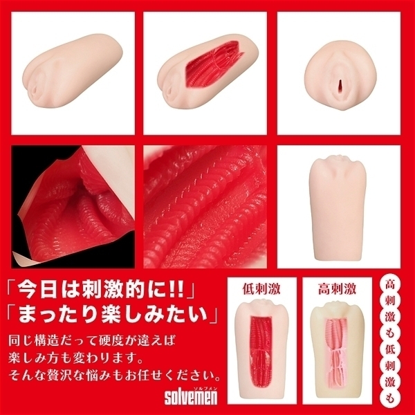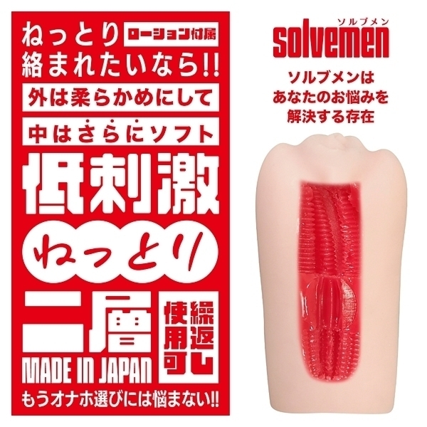| ソルブメンはあなたのお悩みを解決する存在です。 皆様はこのような話をご存知でしょうか?「オナホは同じ構造でも素材が変わると使用感が違う」はい大正解です。 それは真理です。 でも世の中は同じ構造かつ別素材のオナホを必ずしも発売してくれません。 それでは素材の違いによる使用感の変化を楽しむ事ができません。 そんな時こそsolvemenにお任せください!全く同じ構造ながら二層構造の内部素材を変えたものがコチラ。 「高刺激こすられ二層」と「低刺激ねっとり二層」になります。 見た目は同じなのにアラ不思議。 高刺激と低刺激を楽しめます。 まるで魔法のようにあなたの快感を惑わせる事でしょう。 素材だけではございません。 「絶頂刺激連続ヒダ突起構造」と名付けた特殊な内部構造をご覧ください。 どの素材でも一定の感度を担保する安定感の高い内部構造となっております。 あなたはオナホ選びに悩む必要はなくなります。 あなたのためにソルブメンがいるのです。 安心安全の日本製で繰り返し何度でも利用が可能です。 ●低刺激 |