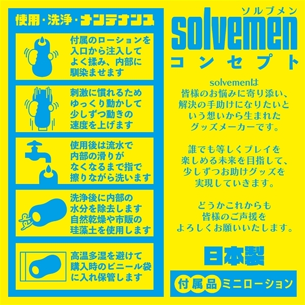 | ソルブメンはあなたのお悩みを解決する存在です。 「今日はイボで刺激的に」「今日はヒダでやさしく」同じものを使い続けたいときもあれば、1日おきに違うものを使いたいときもある。 そんな気まぐれに全力で応えたいです。 それがソルブメンの生まれた意味だと思いませんか?今回のテーマは「めっちゃヒダ」となります。 今こそ王道のヒダで勝負する意図とは?ヒダは常に王道かつ安牌。 それは間違いないのです。 しかしヒダも千差万別。 配置や素材一つで快感は簡単に変わります。 ヒダの絶妙な掘り込み具合で生まれる極上の擦られ感覚をお楽しみください。 あなたはオナホ選びに悩む必要はなくなります。 あなたのためにソルブメンがいるのです。 安心安全の日本製で繰り返し何度でも利用が可能です。 |