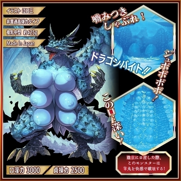 | トルソーオナホは数あれど、複乳オナホは見たことあるかい!?龍の牙がチ●コをしゃぶる!太古のフェラチオドラゴンが目を醒ます!ただのフェラチオじゃない。 ド級のフェラチオ、ドフェラチオだ!友達と遊び終え自宅で自慰に耽る少年。 そう、実はこのカードで少年は性欲を覚えてしまった!勃●する自分に戸惑いながらもアソコに触れると気持ちイイ…。 次第に興奮が高まり初の精通を迎えたその瞬間!純粋なる少年の精通精液がカードにかかったことで封印が解かれてしまう。 恐ろしい咆哮を上げカードに描かれたドラゴンが実体化。 腰を抜かす少年のアソコをドラゴンがすかさずしゃぶる!「んほぉおおおおおおおん!」少年は未知の快楽に思わずドラゴンの咆哮を真似てしまう。 人生初の精通、射●フェラチオ。 彼の性癖はドラゴンで歪んでしまった!もはや普通の人生は送れないが、彼とドラゴンの絆は誰にも邪魔されることは無いだろう。 |