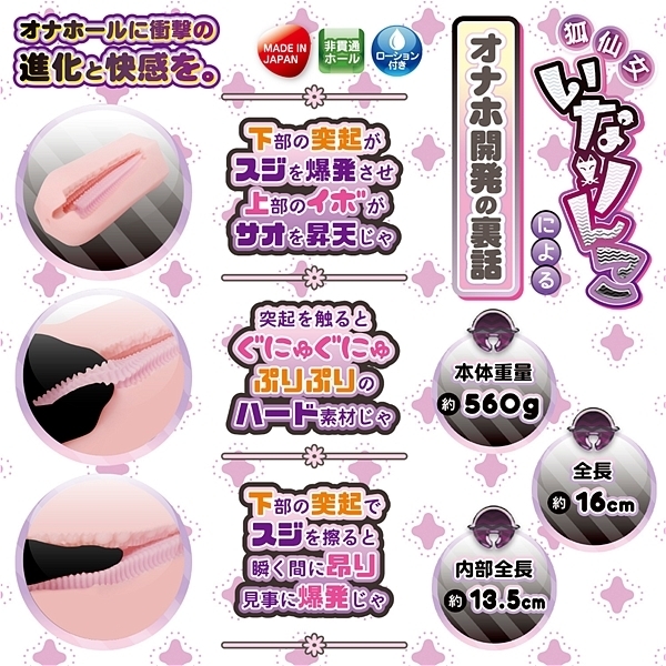 | 狐仙女による新たな刺客が届いた!!それが「スジ爆発!裏なめ子」である。 いなりんこは妖術と神力を使い分ける稀有な狐仙女の次女。 スケベな事が大好きで男性向け性的竹輪を研究する。 今回いなりんこは「スジ爆発」というコンセプトを得て新たな境地に達する。 ふわふわ続きだったアウターに、ほんの少しのプリプリ感をミックス。 柔らかいだけじゃなくリアルな締まりを再現する事に成功。 ヒダとイボの鉄板構造で既に満足度は120%を超える。 そこにスジが爆発するほどの突起を配置したら…もちろんスジ爆発の完成だ。 ハード素材で確かな存在感を放つ、恐るべきスジ攻め突起を感じてほしい。 もうダメと言っても無理やりイカせるほど、それは強烈な快感がおそってくるだろう。 「スジもサオも快感も全力で爆発じゃ!」 |