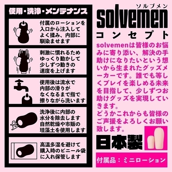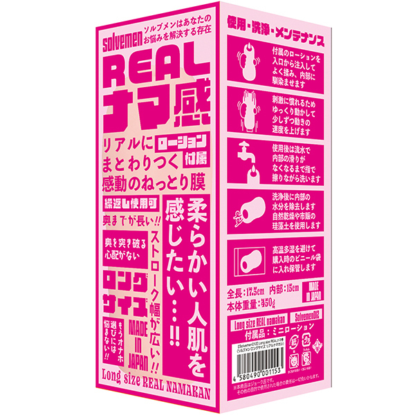 | ソルブメンはあなたのお悩みを解決する存在です。 「ロングサイズ REALナマ感」は大きくても全てを包み込むお悩み解決ホール。 普通のホールでは物足りないアナタでも、ソルブメンのロングサイズなら全てを包み込まれる悦びを感じられる事でしょう。 人肌素材のリアル二層弾力で快感のバランス抜群に良く包み込みます。 この喜びを知ったらもう普通のホールには戻れません。 あなたはオナホ選びに悩む必要はなくなります。 あなたのためにソルブメンがいるのです。 安心安全の日本製で繰り返し何度でも利用が可能です。 |