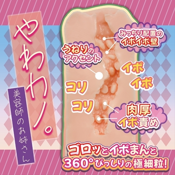 | 美容師のお姉さんへの淡い憧れをコンセプトにした非貫通オナホールです!柔らかくしっかりとした肉厚の内部構造が、まるでお姉さんのカラダそのものを感じさせます♪360度びっしりと配置された小粒と大粒のイボが、絶妙な刺激を提供し、挿入時の快感を高めます!S字を描く穴道と、突起が立ち並ぶ表面が心地よい抵抗感を生み、徐々に高まる快感を楽しめます♪国内生産の高品質エラストマー素材を使用しており、長くご愛用いただける耐久性も抜群!美容師のお姉さんとの秘密のひとときを感じさせる、新感覚のオナホールをぜひお試しください。 |