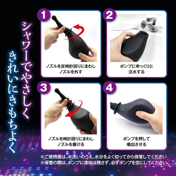 | シャワーでやさしくきれいにきもちよく。 アナルほか噴出洗浄器「エイナスシャワー」!ラブ・ライフにぴったりな多目的洗浄器が新登場。 大容量360ミリのポンプに水を入れれば、先端ノズルの四方の穴からビュビューッと噴出できちゃいます!先端ノズルは、差し込んで使えるように、硬めのハードシリコン仕様。 ポンプは、水を押し出すように、ふんわり柔らかなソフトPVC素材!ノズルとポンプは分割可能なので、注水やお手入れも簡単です。 いろいろ使える噴出ポンプなので、アナルやアソコの洗浄はもちろん、オナホの内部洗浄もOK!中に液体を変えれば、ローション注入器や洗浄液注入器とも使えちゃう! |