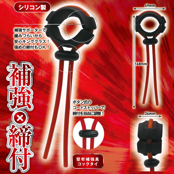 | 根本を締めてメンズキングに!快感キングクラスのコックタイ、「締王」!根本に巻きつけて、ネクタイのようキュッと締めれば、まるで王者のような貫禄に大変身!締め付け部分のコードストッパーは、自由に調整できるボタン式!本体素材は、肌触りがよいシリコン製!締め付ければ、もう貴男はまさにメンズキング!タイプ「X」は、「XENO」の「X」!外部サポーターを組み込んだ、紐だけでない補強具付きのコックタイです。 上下に分かれた補強サポーターで、サオをガッチリ固く挟み締め!動いても緩まない、高い堅牢性も特徴です。 強力サポーターで、ガッチリ補強に大変身! |